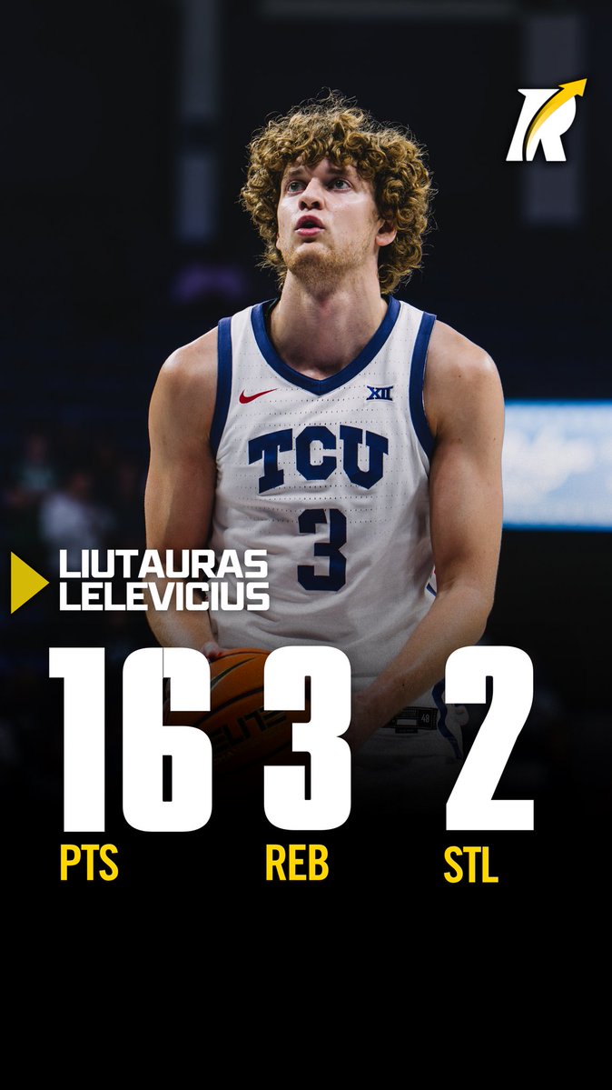 Liutauras Lelevicius gave TCU a jolt against Kansas City — the 6’7”, 225-pound junior guard dropped 16 points, 3 boards, and 2 steals, showing off his smooth touch, size, and scoring feel on the perimeter.