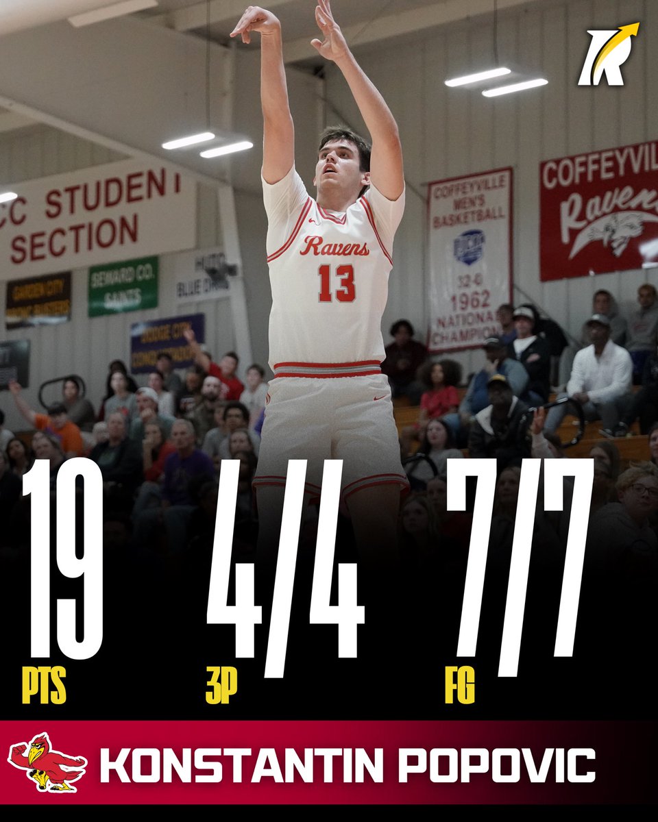JC: 6’5 sophomore guard Konstantin Popovic of Revocruit-Powered Coffeyville delivered a perfect shooting performance — 19 points, going 4-for-4 from beyond the arc and 7-for-7 from the field in a 78–62 victory.