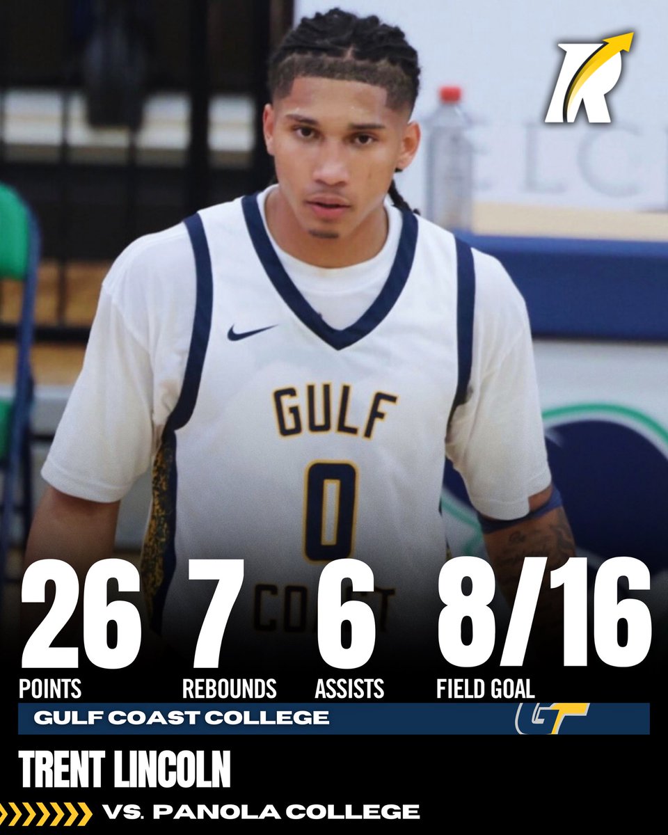 JC: 6’3 sophomore guard Trent Lincoln of Gulf Coast delivered a dominant performance — 26 points, 7 rebounds, 6 assists, while shooting 4-for-11 from deep and 8-for-16 from the field in a 91–71 victory.