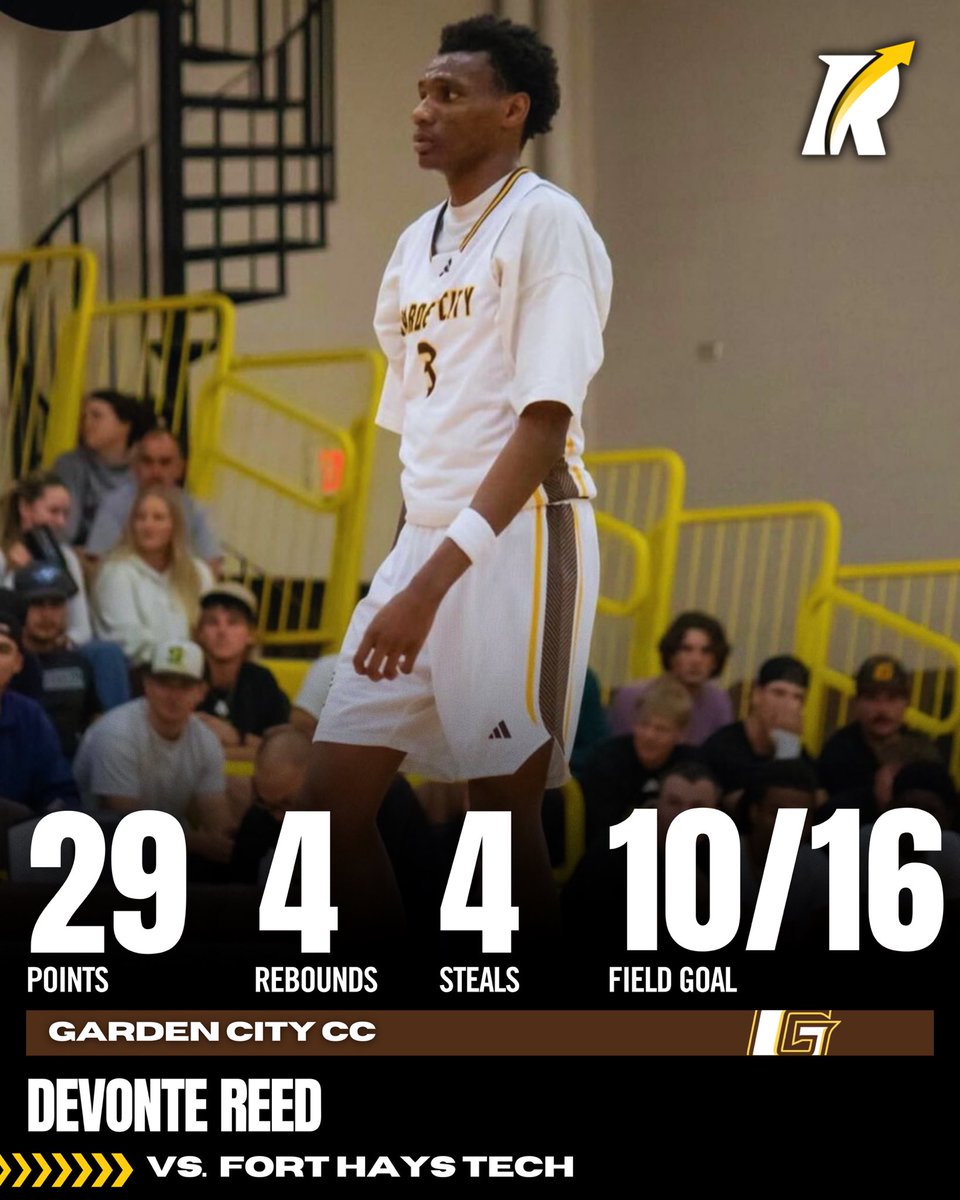 JC: 6’5 sophomore guard Devonte Reed of Garden City put together a high-level performance — 29 points, 4 rebounds, 4 steals, 2 assists — shooting an efficient 10-for-16 from the field in a 98–95 win.