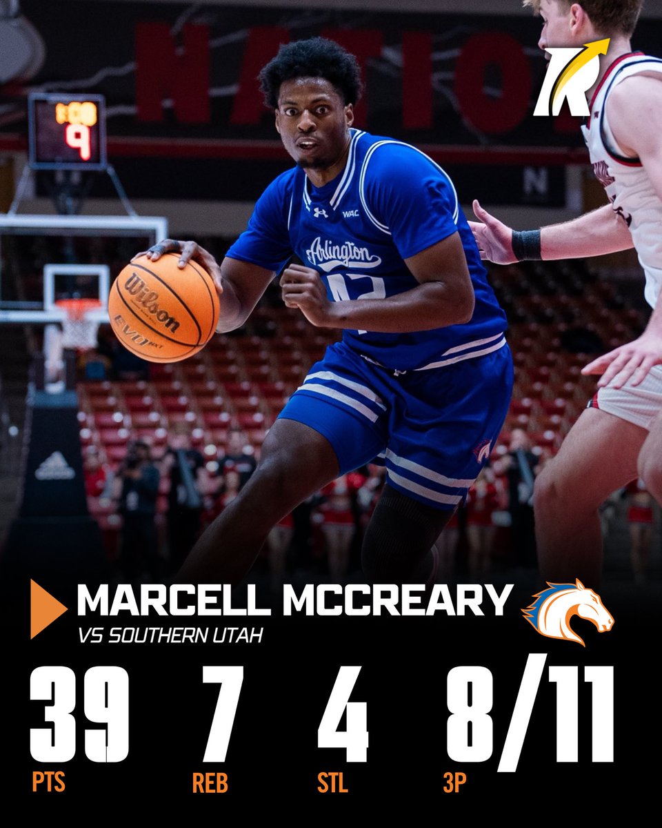 Marcell McCreary put on a show for UT Arlington in a road win over Southern Utah, erupting for 39 points, 7 boards, and 4 steals while shooting an ultra-efficient 12-for-16 from the field and 8-for-11 from deep. The senior guard has now scored 12+ in 10 straight games as the Mavs