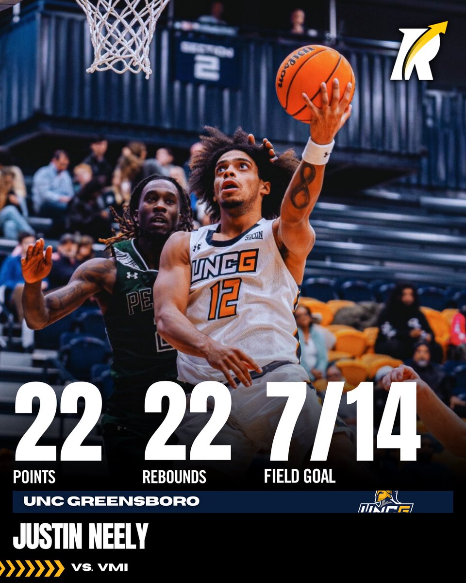 Justin Neely was dominant for UNC Greensboro against VMI, pouring in 22 points and grabbing 22 boards while finishing an efficient 7-of-14 from the field. The 6’6”, 220-pound senior controlled the paint on both ends and imposed his will physically all night.