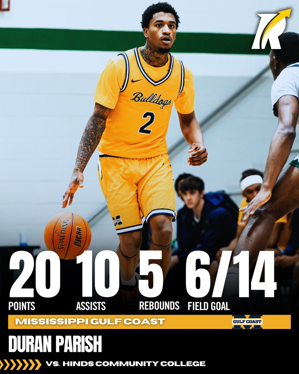 JC: 6’2 sophomore guard Duran Parish of Mississippi Gulf Coast (@MGCCC_MBB), a Revocruit Powered JUCO, delivered an impressive double-double with 20 points and 10 assists, adding 5 rebounds while shooting 2-for-4 from beyond the arc and 6-for-14 from the field in an 86-82