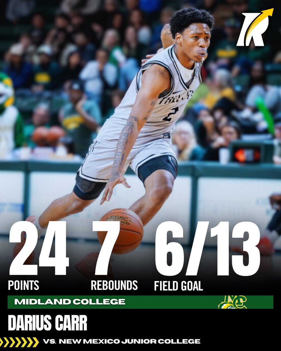 JC: 6’4 sophomore guard Darius Carr (@dlowellcarr) of Midland College delivered 24 points and 7 rebounds while shooting 6-for-13 from the field in an 87-78 victory.