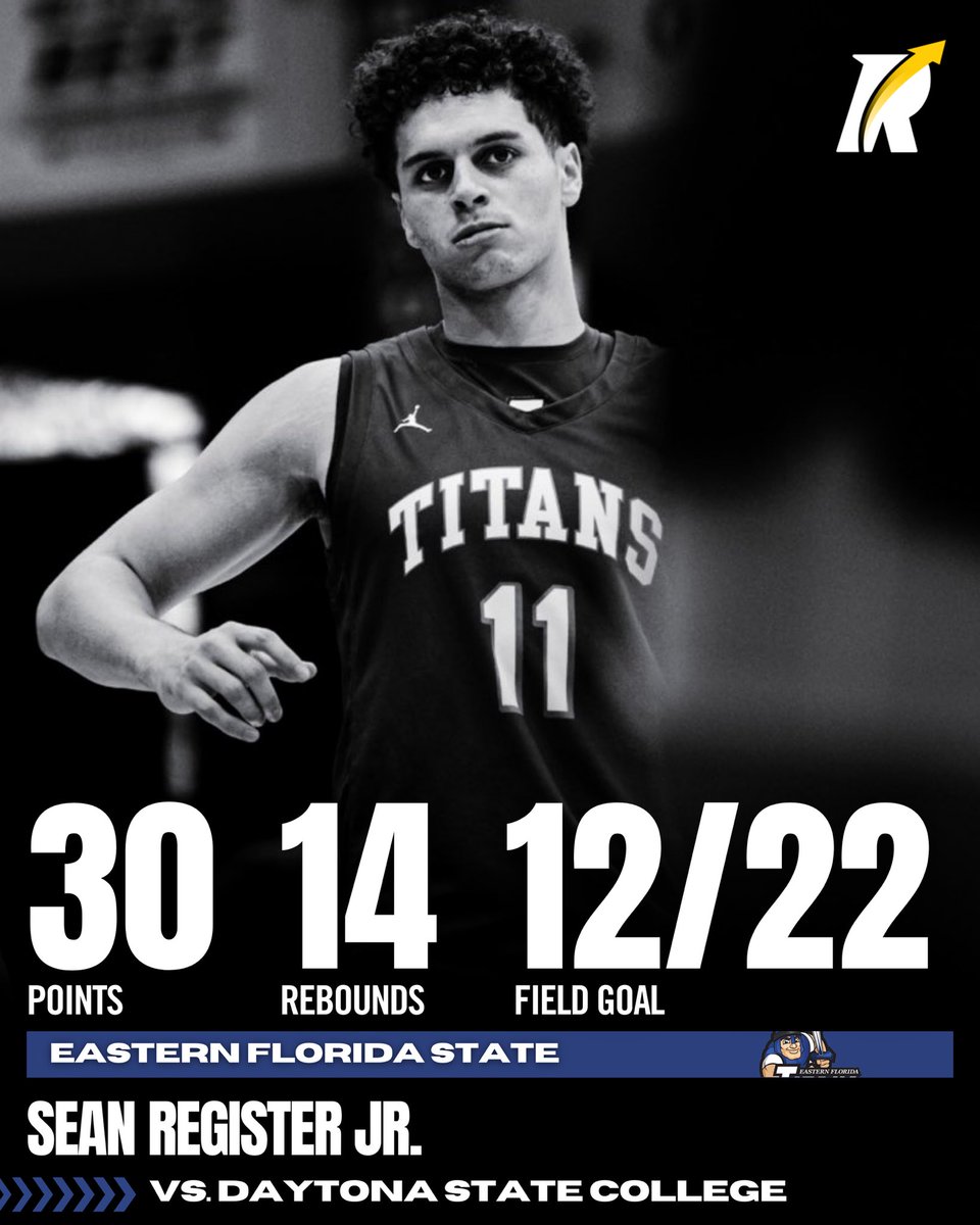 JC: 6’7 freshman forward Sean Register Jr. of Eastern Florida State delivered another dominant double-double, 30 points, 14 rebounds, shooting 12-for-22 from the field in a 98–93 victory.