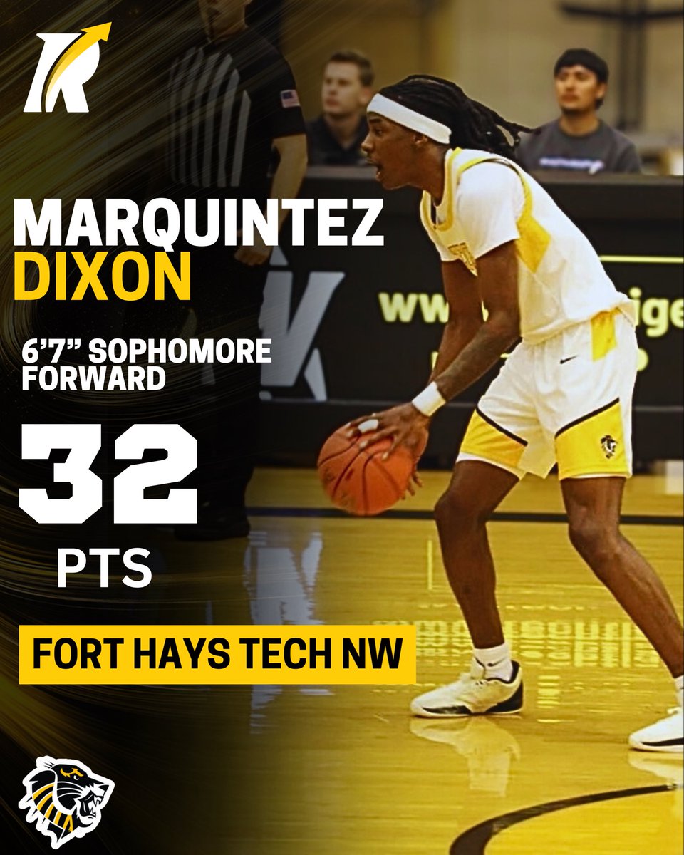 JC: 6’7 sophomore forward Marquintez Dixon of Fort Hays Tech Northwest erupted for 32 points, 4 rebounds, and 3 assists while shooting 10-for-16 from the field in an 89–82 victory over Cowley County.