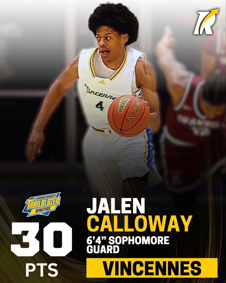 JC: 6’4 sophomore guard Jalen Calloway of Vincennes erupted for 30 points, dishing off 6 assists, 3 rebounds, shooting 2 for 3 from beyond the arc and 10 for 17 from the field in a 90–66 victory.