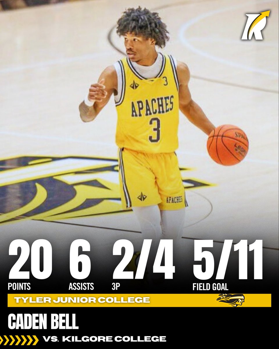JC: 6’1 sophomore guard Caden Bell of Tyler JC (@Tyler_MBB) delivered 20 points and 6 assists while shooting 2 for 4 from beyond the arc and 5 for 11 from the field in an 86–83 victory.